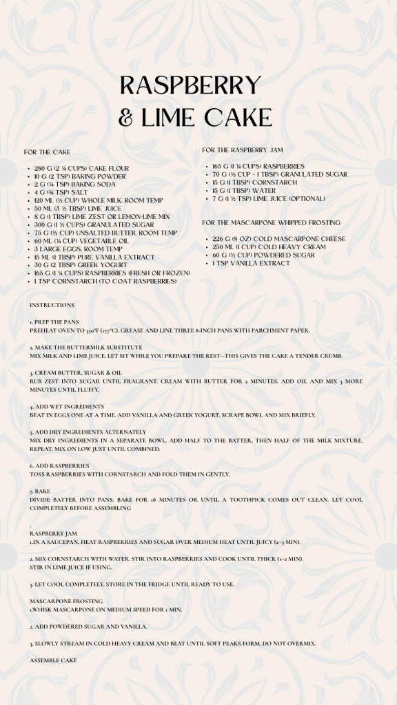 If I could turn a summer day into a cake, it would taste exactly like this: soft lime-scented layers, bursts of juicy raspberries, and a cloud-like mascarpone frosting that feels like a warm hug. This cake is bright, fresh, and indulgent in all the right ways—and yes, it tastes just as dreamy as it looks.
